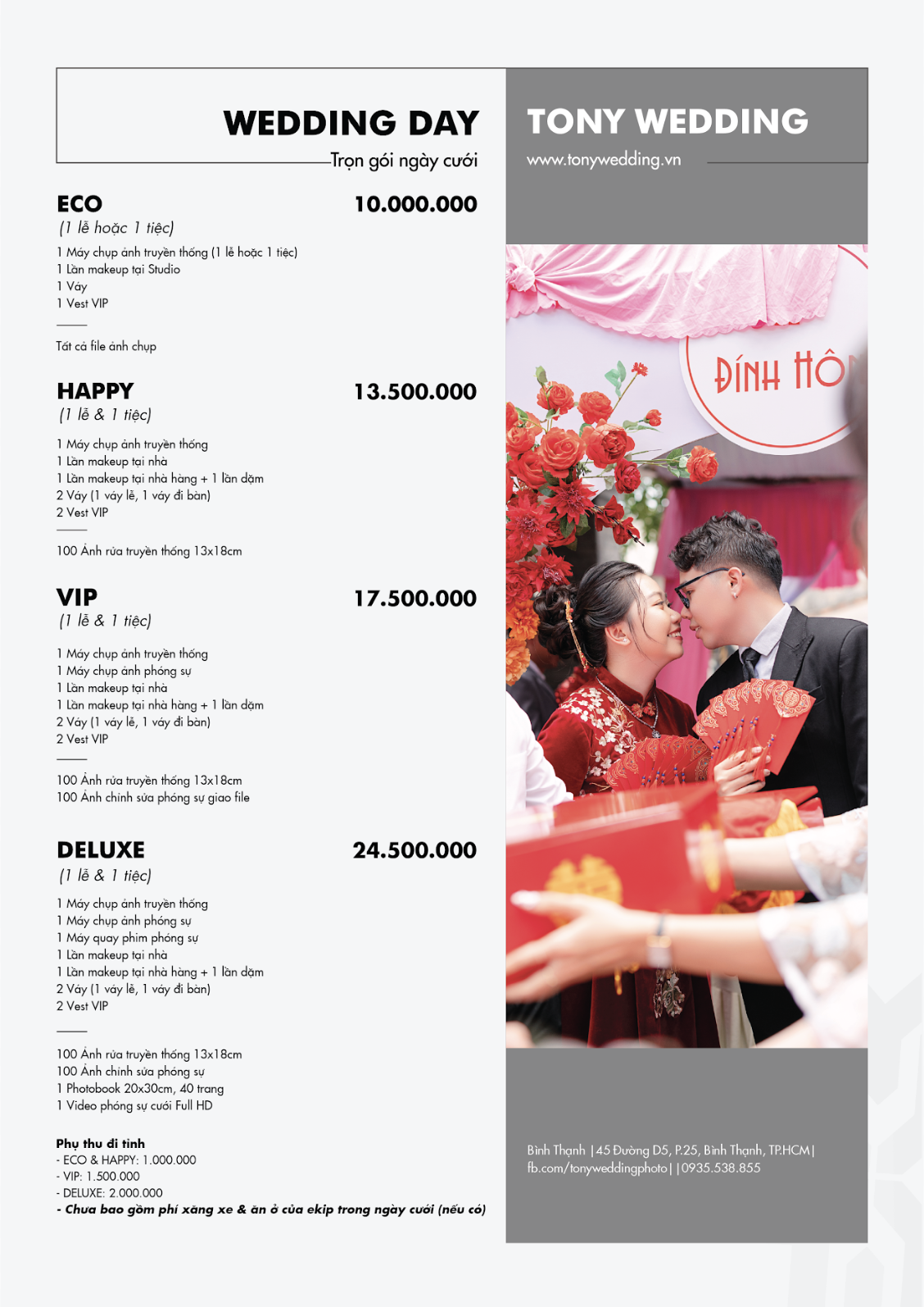 •    Photo + Makeup (trang điểm và làm tóc theo từng trang phục) + phụ kiện + hoa cầm tay
